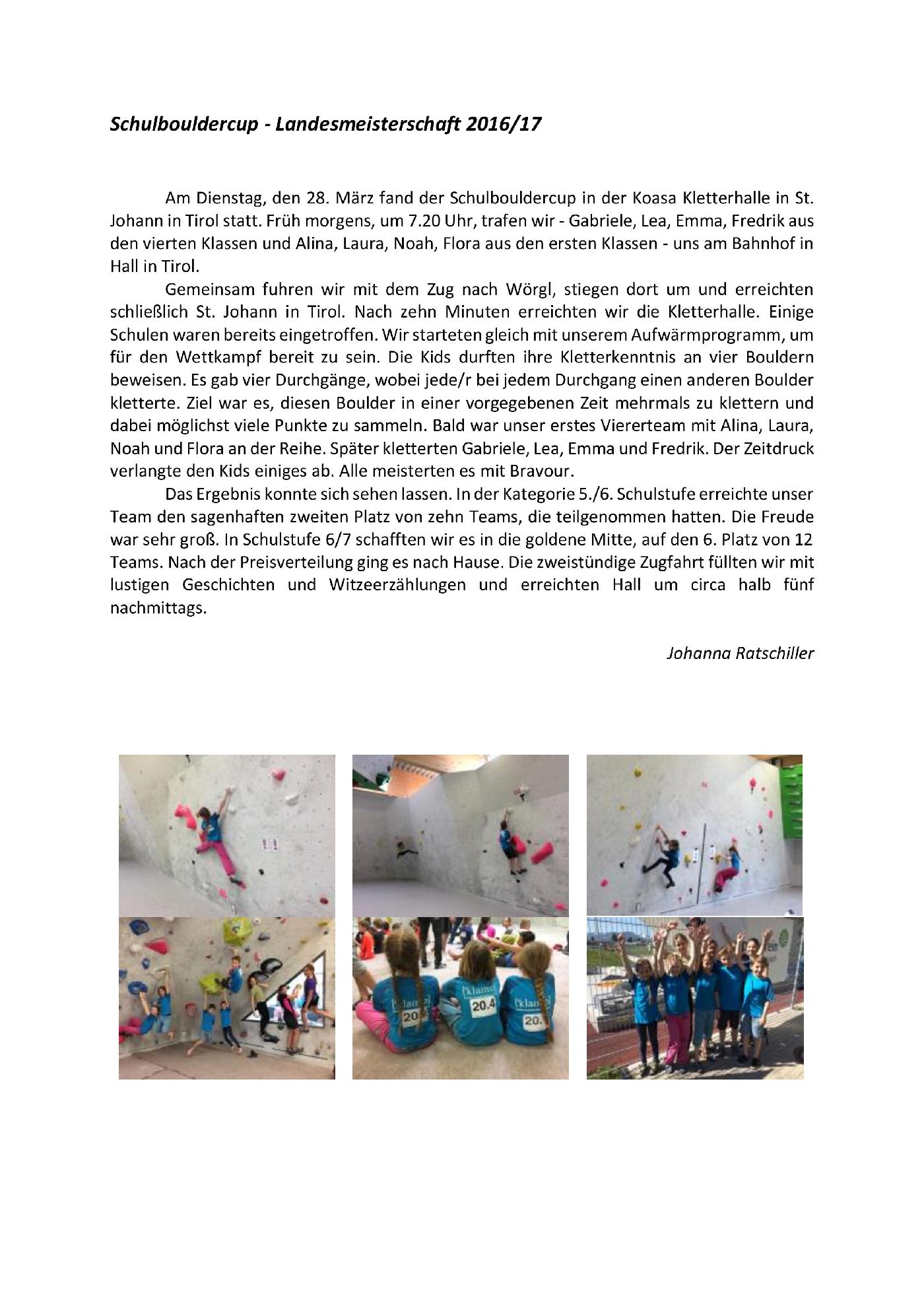 Am Dienstag, den 28. März fand der Schulbouldercup in der Koasa Kletterhalle in St. Johann in Tirol statt. Früh morgens, um 7.20 Uhr, trafen wir - Gabriele, Lea, Emma, Fredrik aus den vierten Klassen und Alina, Laura, Noah, Flora aus den ersten Klassen - uns am Bahnhof in Hall in Tirol.